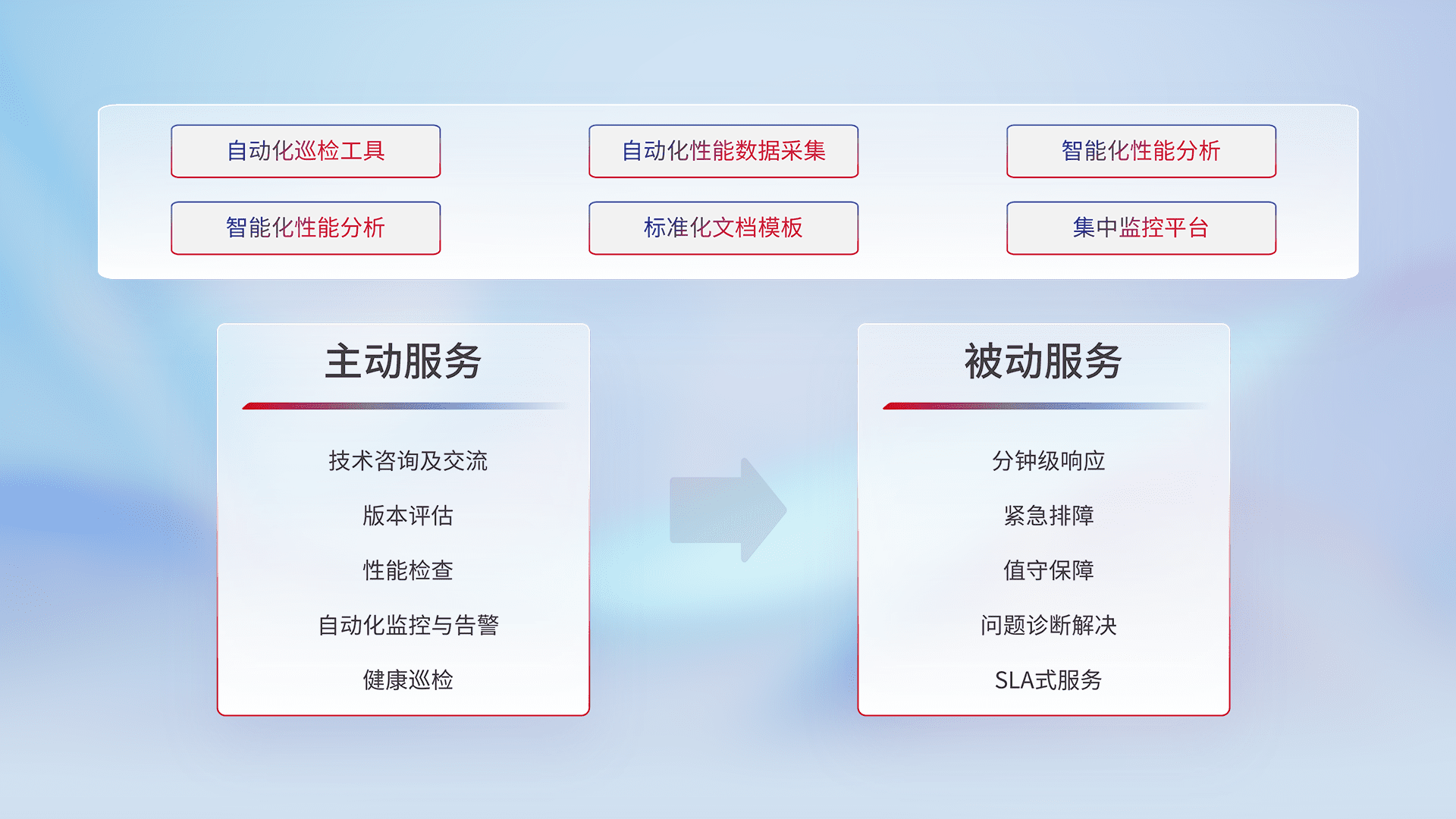 智能化工具和标准化文档,,保障服务质量,,,,提供主动服务(包含技术咨询、、、、版本评估、、、性能检查、、、自动化监控与告警、、、健康巡检)和被动服务包含(分钟级响应、、紧急排障、、值守保障、、、问题诊断解决、、SLA服务)。。